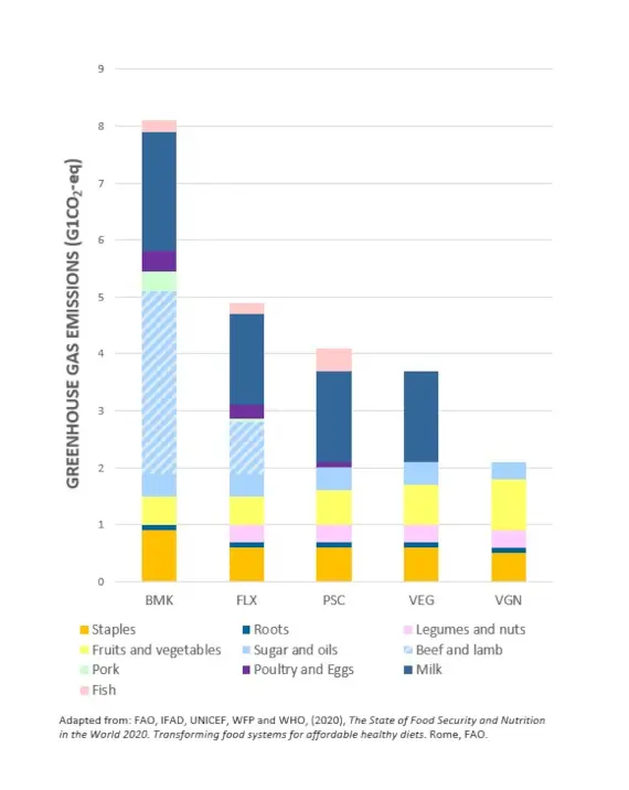 然而,需要注意的是,溫室氣體排放只是飲食對環境影響的冰山一角。水資源和土地的使用、生物多樣性的影響及煤炭的使用是飲食和食物組別對環境影響的其他重要因素,而這些因素在很大程度上又受到農業和農產品供應實踐的影響。