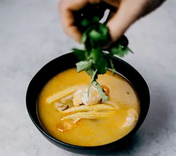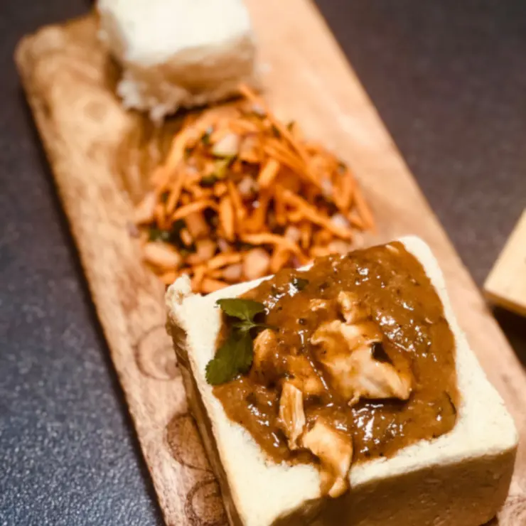 - 裝盤:傳統上用麵包碗盛放。將麵包分四等分,取其中一份,挖出麵包內部軟心(一定要在底部留下一些麵包),加入四分之一咖喱混合物。用香菜裝飾。