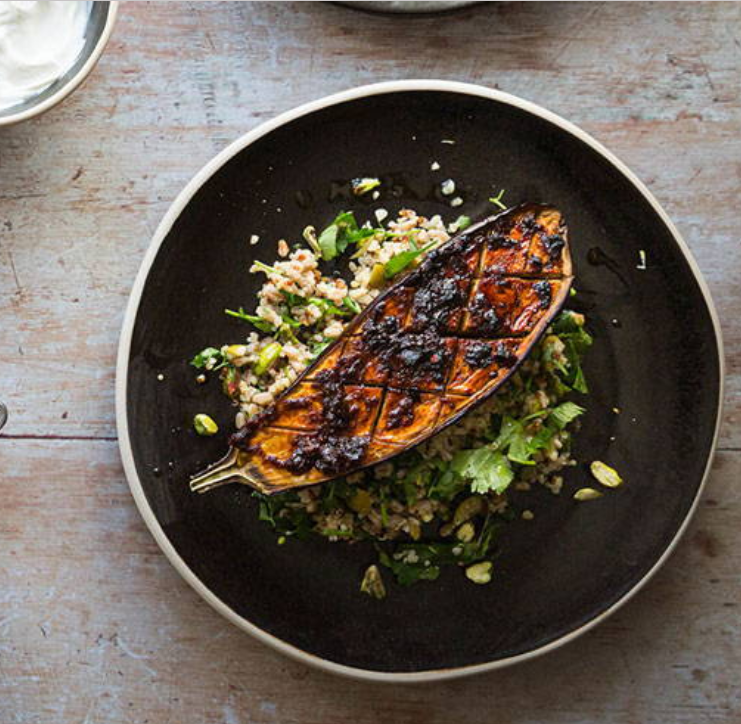 - 將哈里薩辣醬、大蒜、2 湯匙石榴漿和檸檬皮混合在一起。用勺子舀在茄肉上,淋上橄欖油。您可提前一個小時準備,以便讓醃料滲透到茄子中。