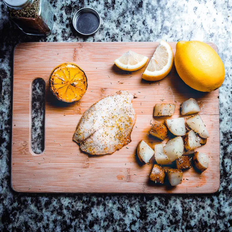 - 將烤箱加熱至 180℃,準備混合的蔬菜進行烘焙。將所有食材放入碗中混合,烤至洋芋軟爛,然後從冰箱中取出醃好的魚片放在上面。放入烤箱中間位置烤大約 20 分鐘,直至將魚完全烤熟,能夠輕鬆切成薄片。