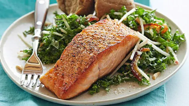 - 在鮭魚上撒上 1/2 茶匙鹽和少許胡椒粉。開中小火,在大號不粘鍋中加入少許橄欖油。調至中大火。將鮭魚皮朝下放入鍋中。煎大約 4 分鐘,直到一面變成金黃色。用鏟將魚翻面,再煎約 3 分鐘,直至魚片變硬。
