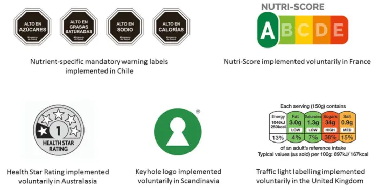 - Warning statements: nutrient specific statements used on foods high in selected nutrients such as sugar or saturated fat, currently used in Chile.