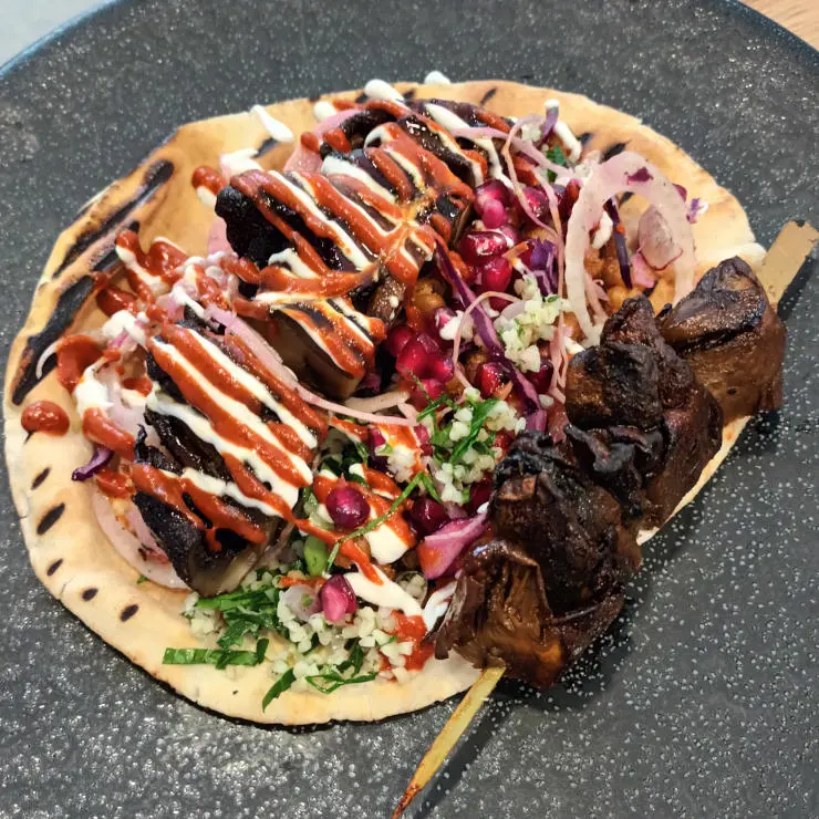 - Serve on a grilled flatbread, layer and top with the houmous, vegetable slaw and crispy chickpeas to taste.