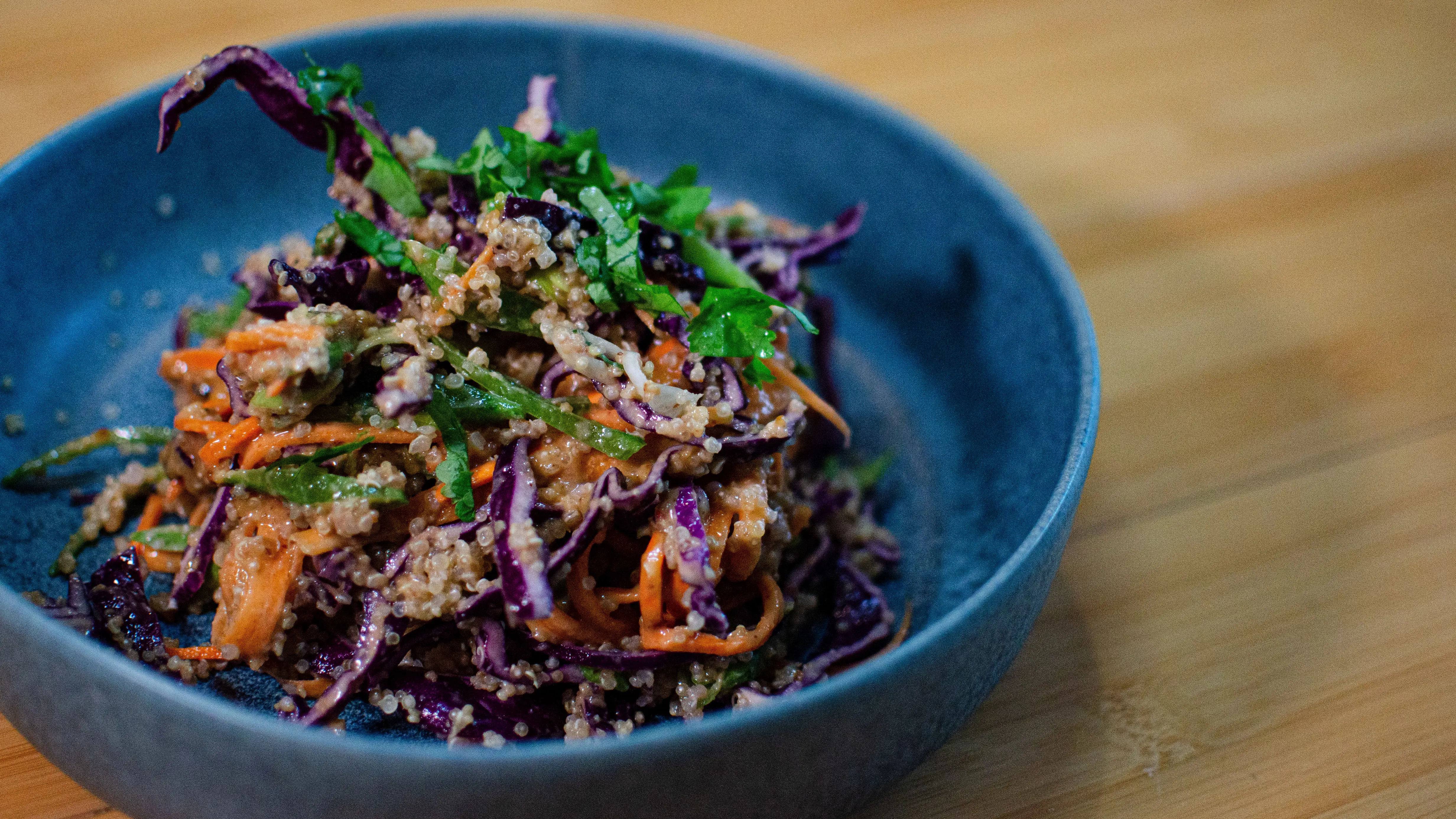 - Add the peanut butter, soy sauce, maple syrup, sesame oil, rice vinegar, lime juice and crushed chilli to a blender and pulse until mixed well and of a dressing consistency.