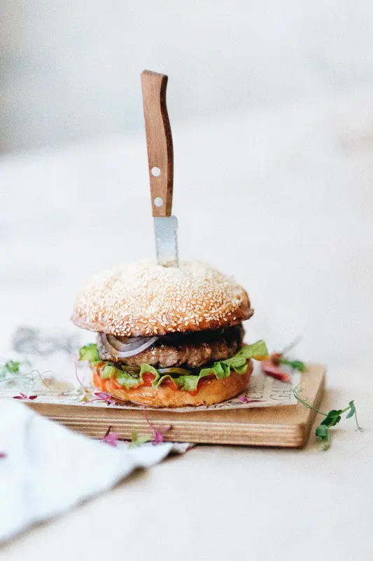 - Sobre una mitad de pan, colocar una hamburguesa, una porción del escabeche y un poco de rúcula, y colocar la otra tapa al lado para que sea vea el relleno.